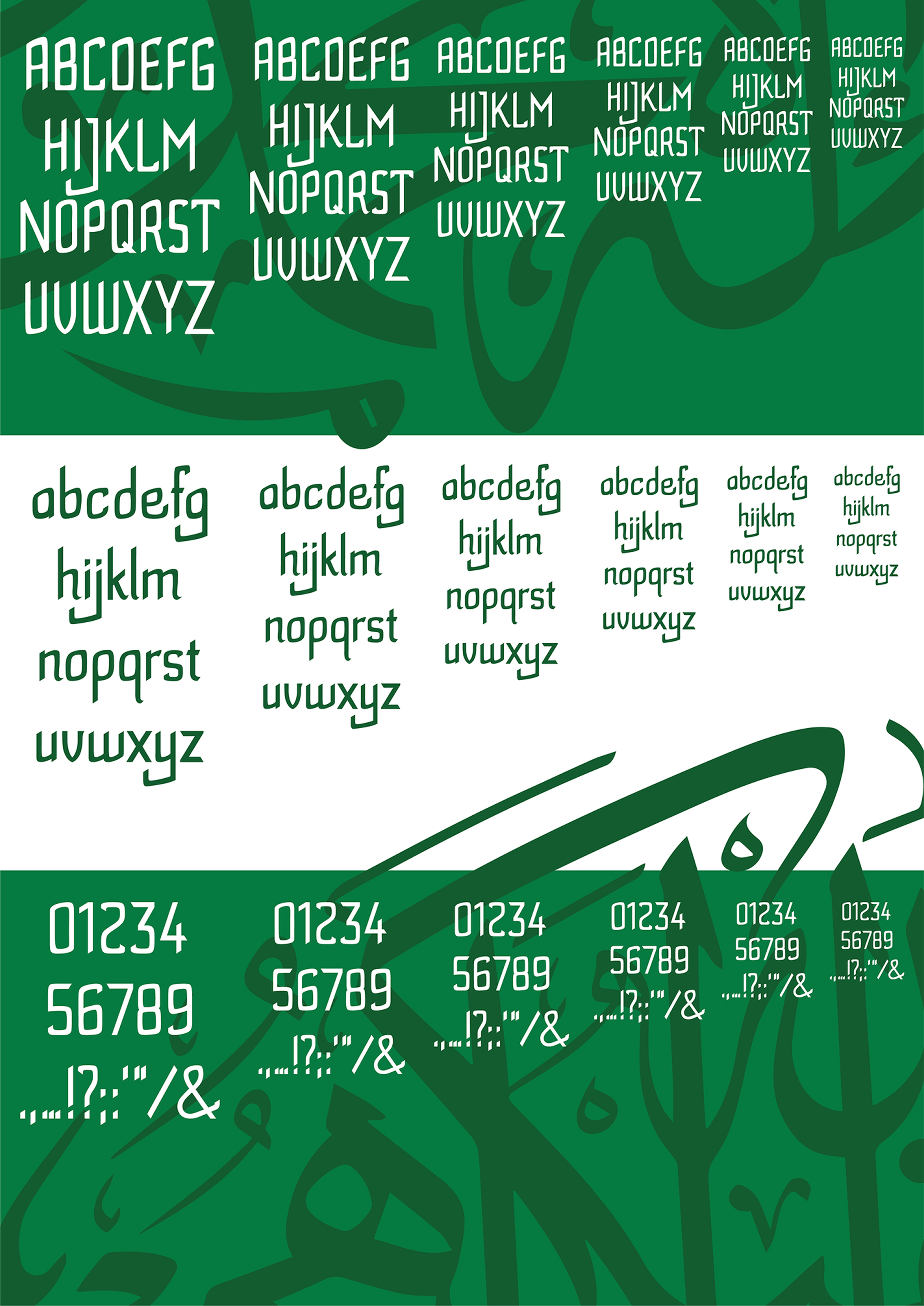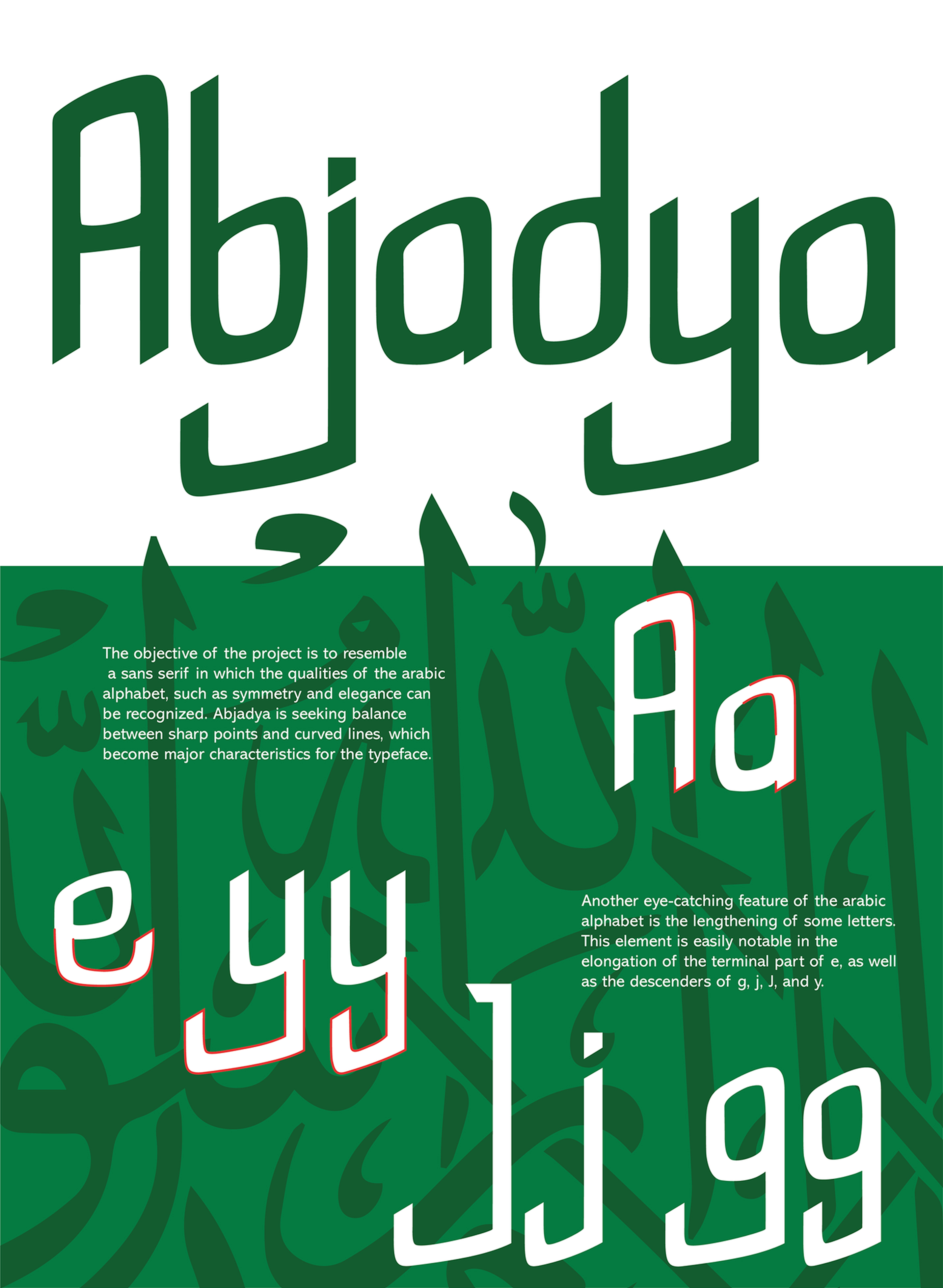 Abjadya is a display typeface shaped by the visual logic of the Arabic alphabet. It balances sharp tapering strokes with soft curves to translate the script's rhythm into a contemporary sans form suited for expressive branding and editorial work.